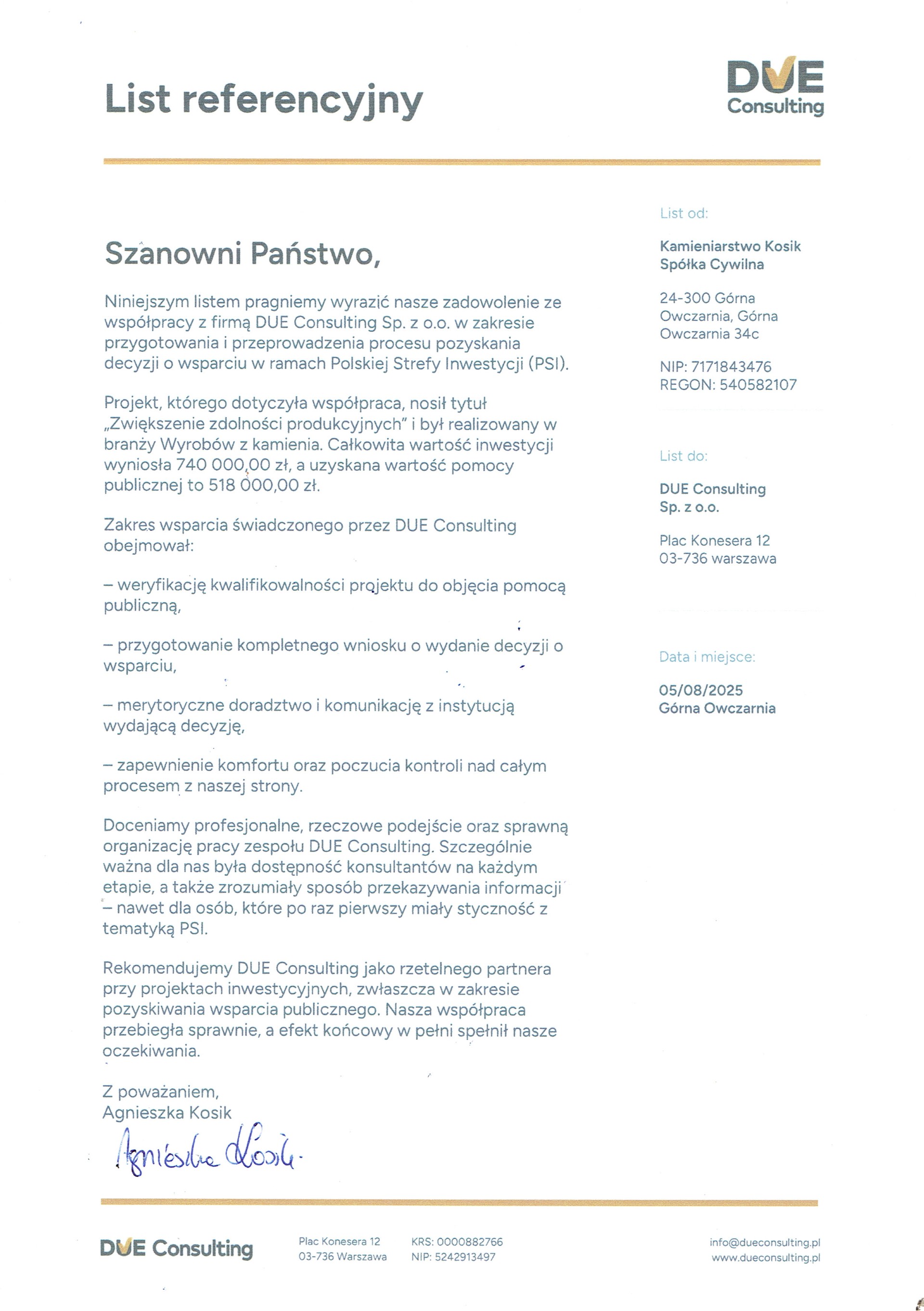 Uzyskanie pozytywnej decyzji o wsparciu w ramach Polskiej Strefy Inwestycji (PSI) dla projektu „Zwiększenie zdolności produkcyjnych” w branży wyrobów z kamienia.